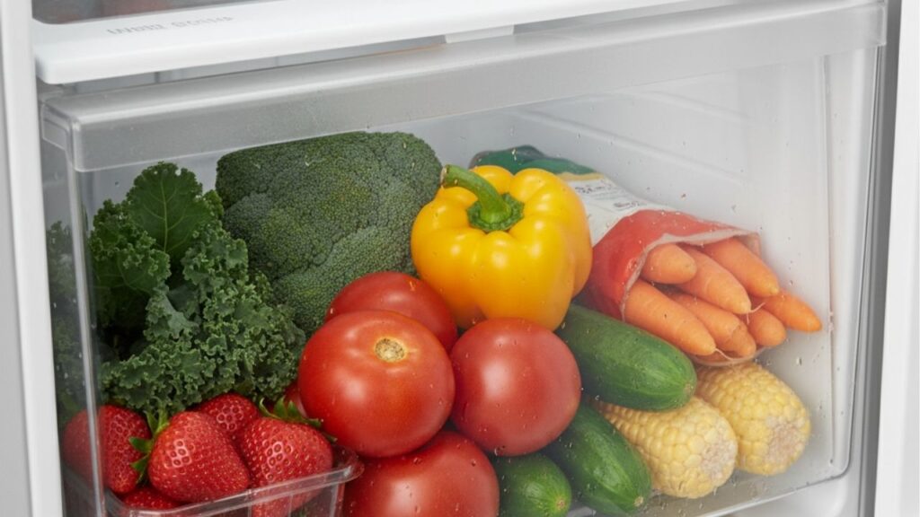 A gaveta de vegetais funciona regulando a entrada e saída de ar para manter níveis diferentes de umidade. Quando fechada, a gaveta mantém a umidade alta, ideal para folhas como alface e rúcula.
